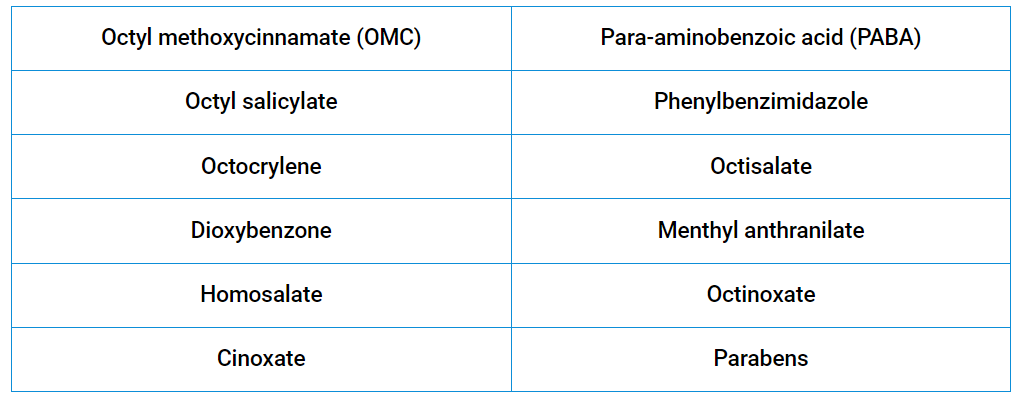 Disturbingly, at least nine of the sunscreen ingredients approved by the U.S. Food and Drug Administration (FDA) are known to disrupt human endocrine function.10 Aside from oxybenzone — which is found in 70% of sunscreens — other commonly used chemicals that can enter your bloodstream and can cause toxic side effects, including hormone disruption, include but are not limited to:11,12