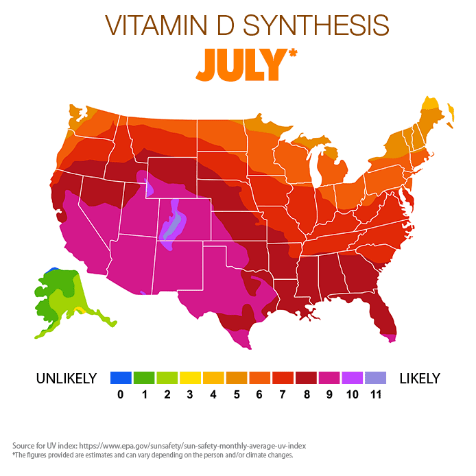 It doesn’t make much sense to expose your skin to the sun when the temperature is lower than 50 degrees F, which has a scarcity of UVB rays. This occurs a lot in most regions in the U.S., especially those who experience four seasons. The charts below display the likelihood of vitamin D synthesis across the U.S. by month. For more information about how to optimize your vitamin D from sensible sun exposure, see my vitamin D resource page.