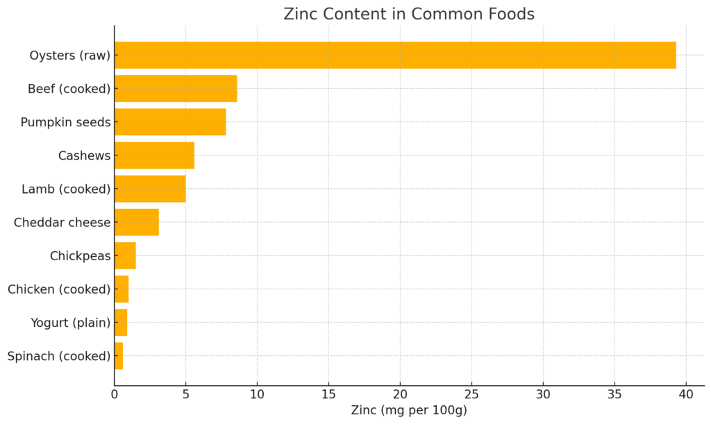 Just 100 grams of raw oysters contain about 39.3 milligrams of zinc. That’s more than four times what you get from a similar serving of beef, pumpkin seeds, or lamb.