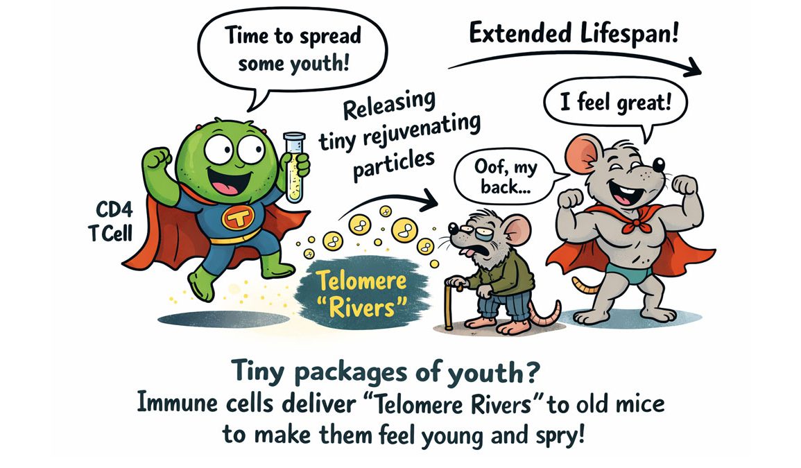 A team of researchers led by Alessio Lanna, along with Salvatore Valvo, Michael L. Dustin, and Federica Rinaldi, has released a provocative preprint describing what they call a transplantable program of youth. Their study, titled “CD4⁺ T cells confer transplantable rejuvenation via Rivers of telomeres,” reports that tiny biological particles released by immune cells dramatically extended lifespan in mice.
